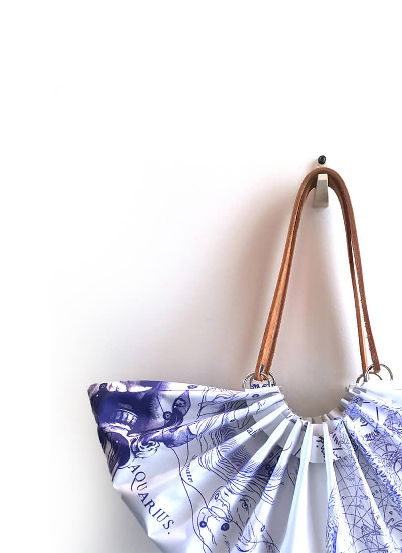 De patronen van de tassen zijn zo bedacht dat ze volledig gemaakt kunnen worden met vouwtechnieken, weeftechnieken en leerbewerking technieken. De origami vouwen, geweven stroken en leer bevestigingen zie je terug in de tassen en zijn onderdeel van het ontwerp.